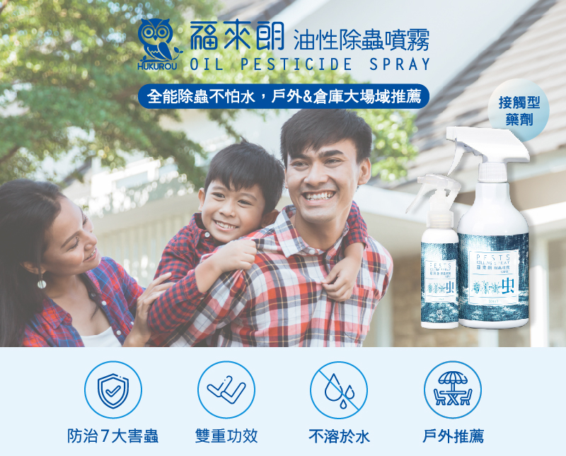 能夠消滅七種害蟲,只要牠們接觸藥劑即會死亡;殘留性佳,藥效長達兩周以上。可用於室內空間,在空中或角落縫隙噴灑。也可針對角落、門窗、排水孔等害蟲棲息的地方使用,藉以防治蚊蟲。