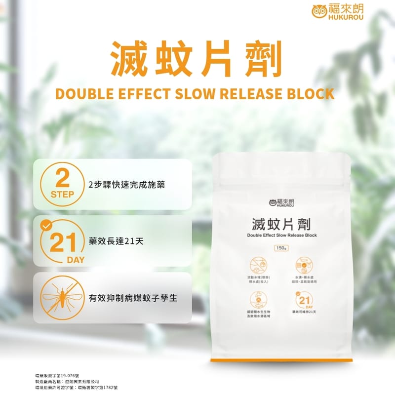可以有效解決蚊子幼蟲,再搭配除蟲噴霧一起消滅蚊子,雙管齊下,效果更佳。藥劑吸附在石膏上,藥效可維持長達三週。可使用在流動水域,以及一般積水處,依照空間大小適度增加石膏的使用量。